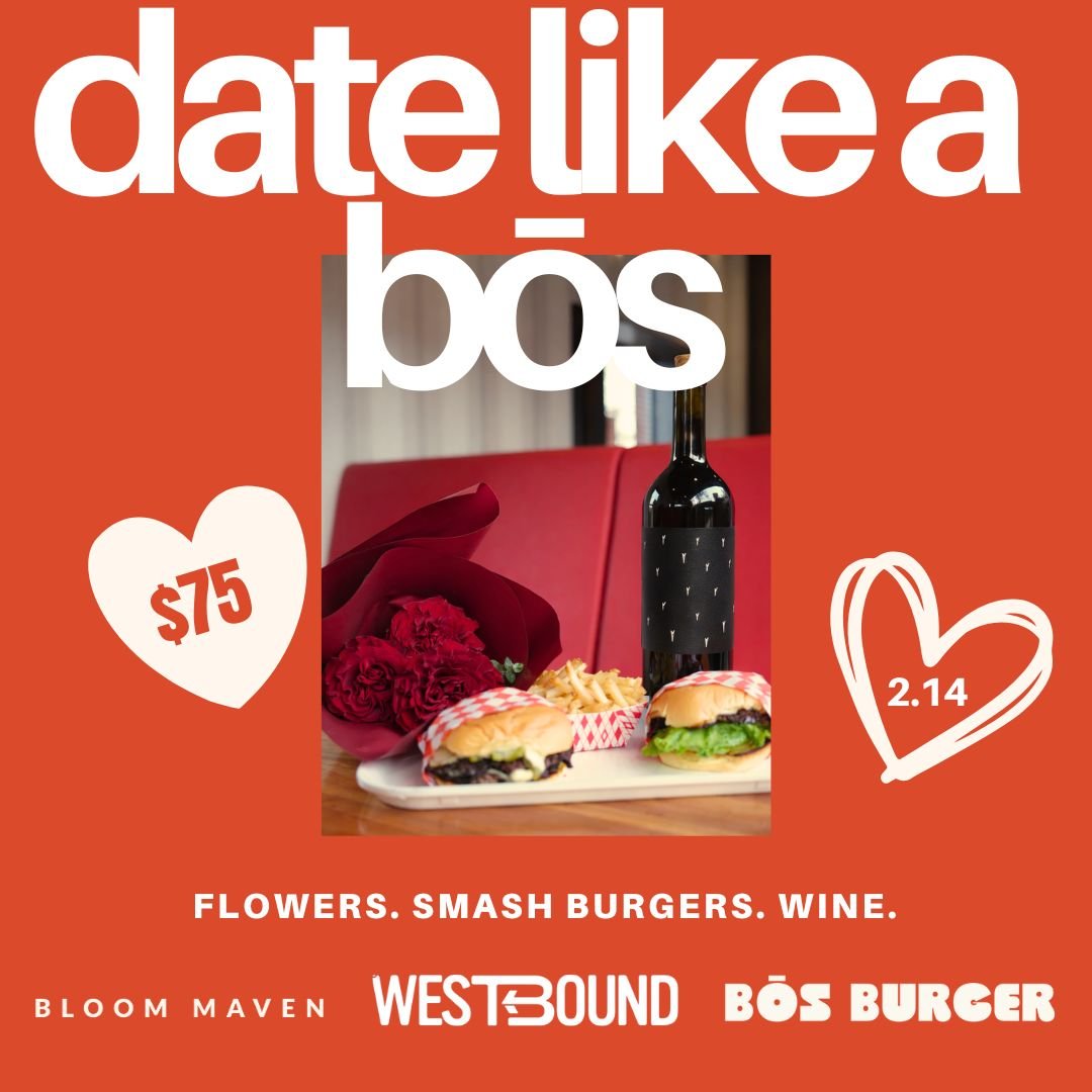 For one day only, Bos Burgers teams up with Bloom Maven and Westbound to bring you the ultimate no-frills, all-heart Valentine’s meal.